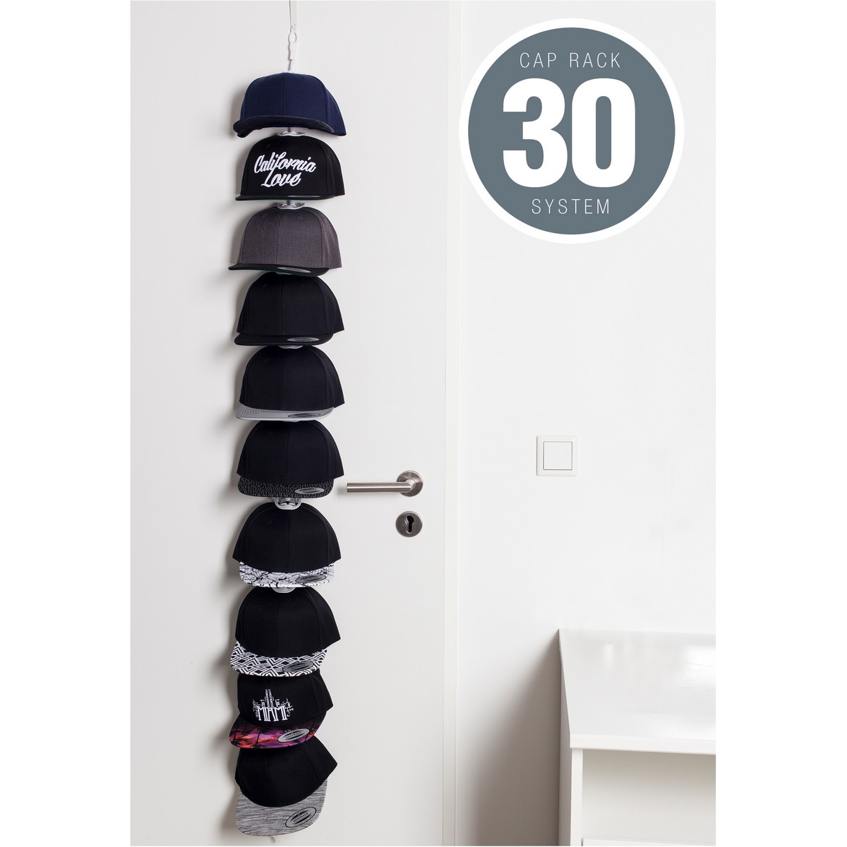 Das CapRack Pro System ist das innovativste Display, Organisations- und Aufbewahrungssystem, das jemals entwickelt wurde. Stell 10 Caps aus und verwahre darunter weitere 20 Stück. So passen insgesamt 30 Stück auf das CapRack. Das CapRack Pro System kann an der Wand befestigt, über die Tür oder im Schrank aufgehängt werden – oder lass es einfach wie ein Mobile von der Decke hängen. Optimal für Kappenfans und -sammler, findet das Display Platz im Wohnzimmer, im Schlafzimmer, in der Garage – einfach überall dort, wo Du Deine Kappen aufbewahren möchtest. Das Set beinhaltet 10 Clips und eine 1,52 m langen Kordel in Weiß sowie Befestigungsmaterial. Die Abstände zwischen den Caps sind individuell verstellbar.